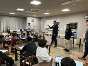 夕食後は恒例のMTGへ。本日の振り返りと、明日へのチャレンジ項目を書き出します。また、コーチ陣より”ラグビー憲章”について説明があり、ラグビーの5つのコアバリューとして紹介されている「品位・情熱・結束・規律・尊重」の重要性について、子供達も真剣な眼差しでコーチの説明を聞いていました。